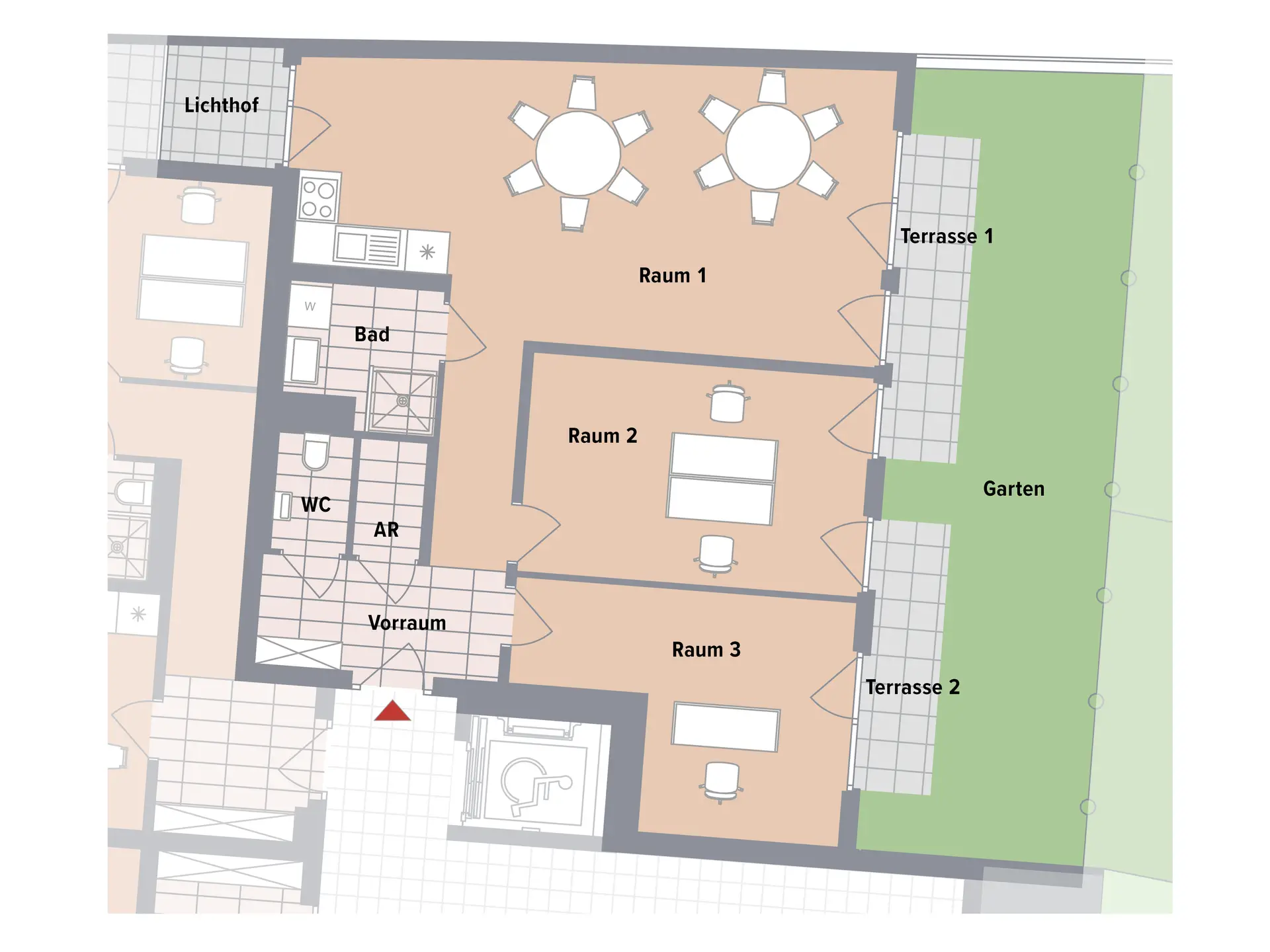 Die Einheit umfasst drei separat nutzbare Räume, einen Vorraum, ein Badezimmer, ein separates WC sowie einen Abstellraum. Eine Terrasse, ein zusätzlicher Lichthof sowie ein Gartenanteil schaffen hochwertige Außenflächen und sorgen für eine angenehme Arbeits- und Aufenthaltsatmosphäre.