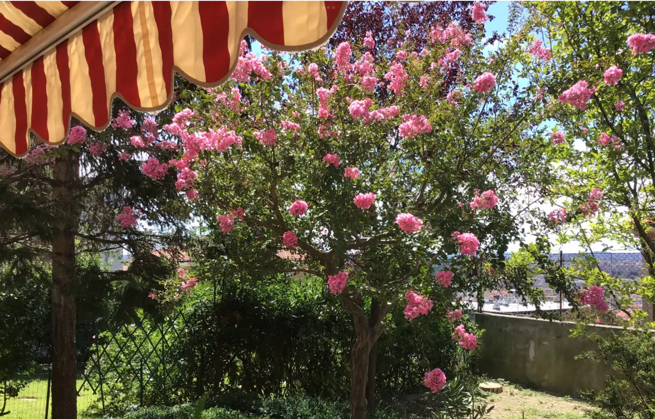 Wunderschöner Außenbereich: Benutzbarer Garten mit gepflegter Flora und Palmen