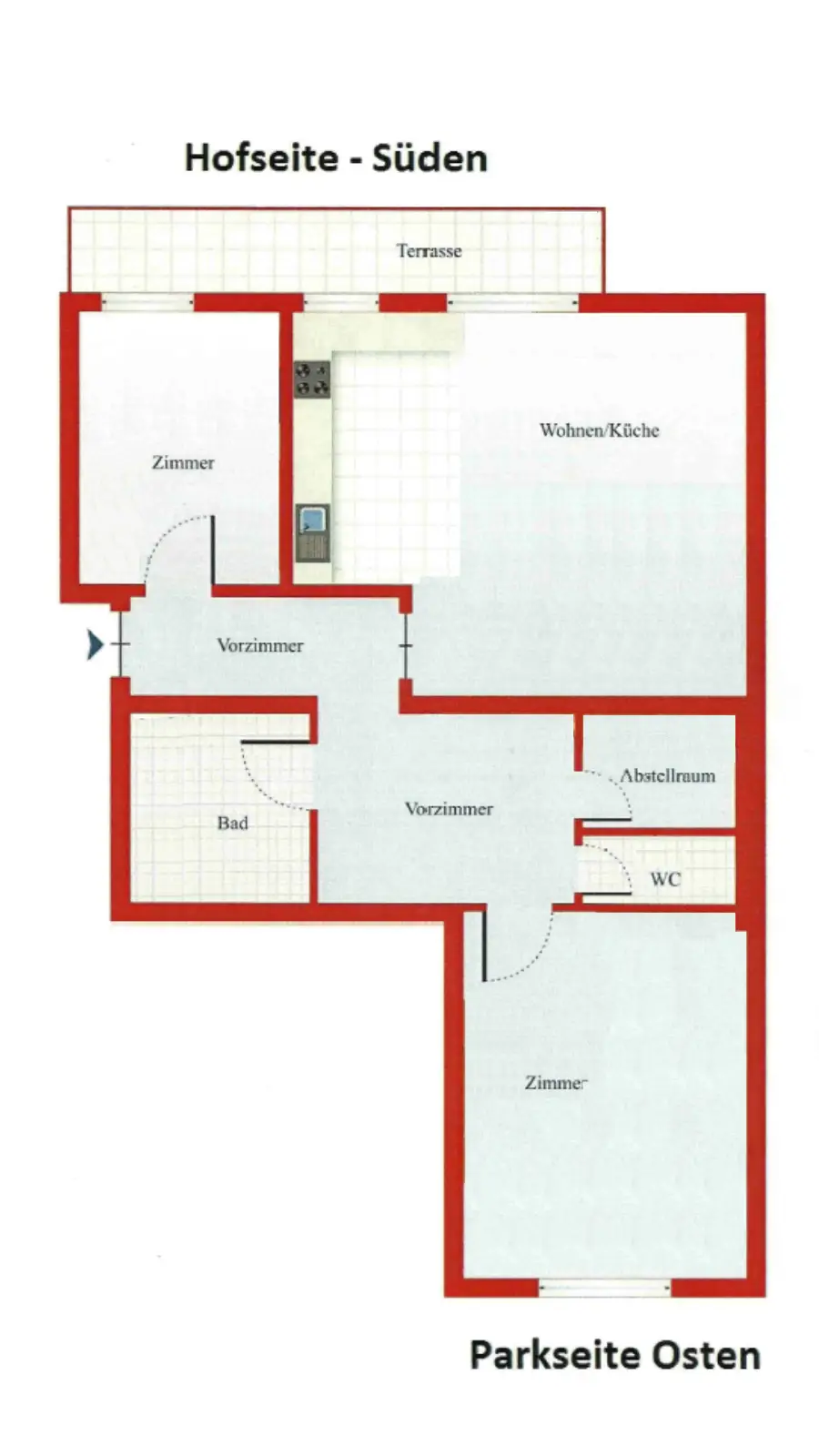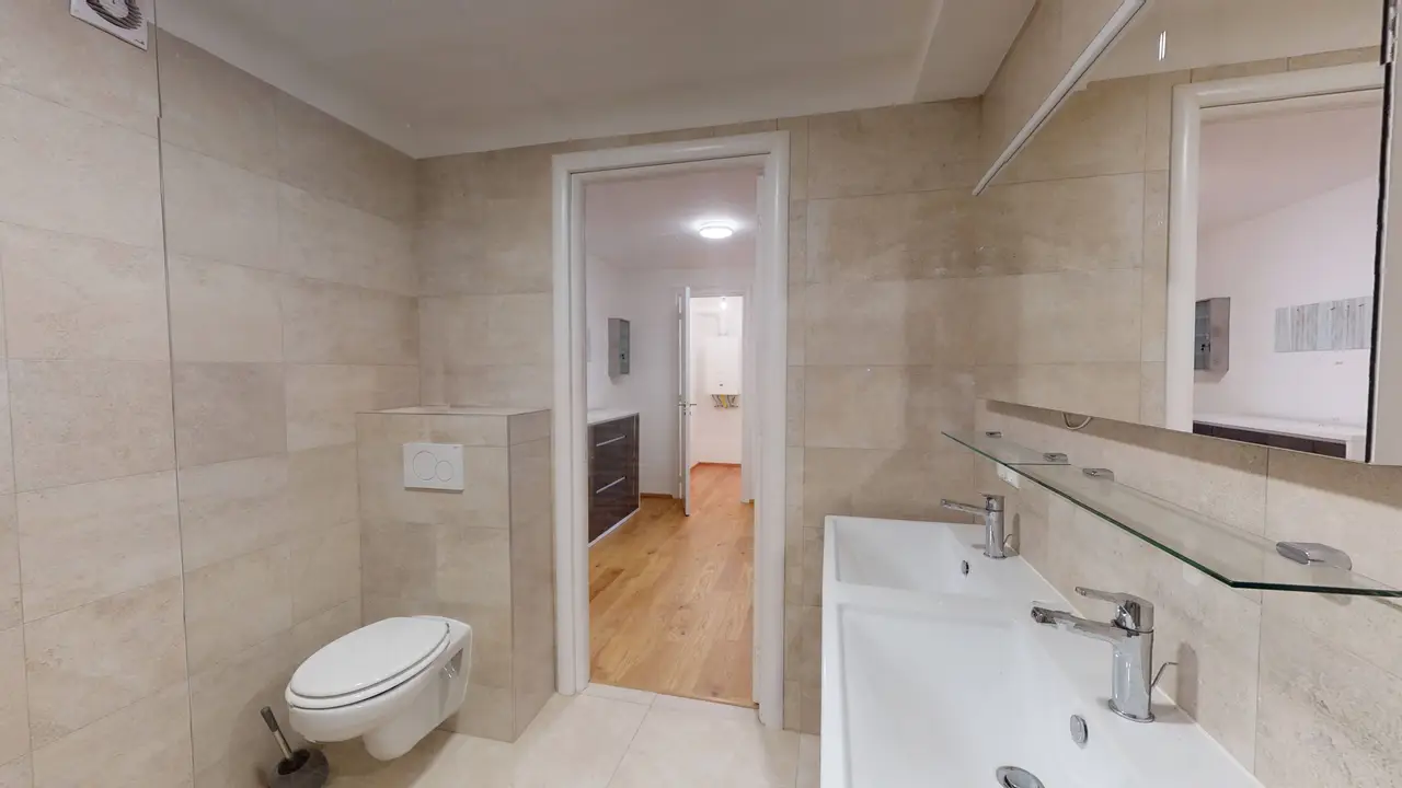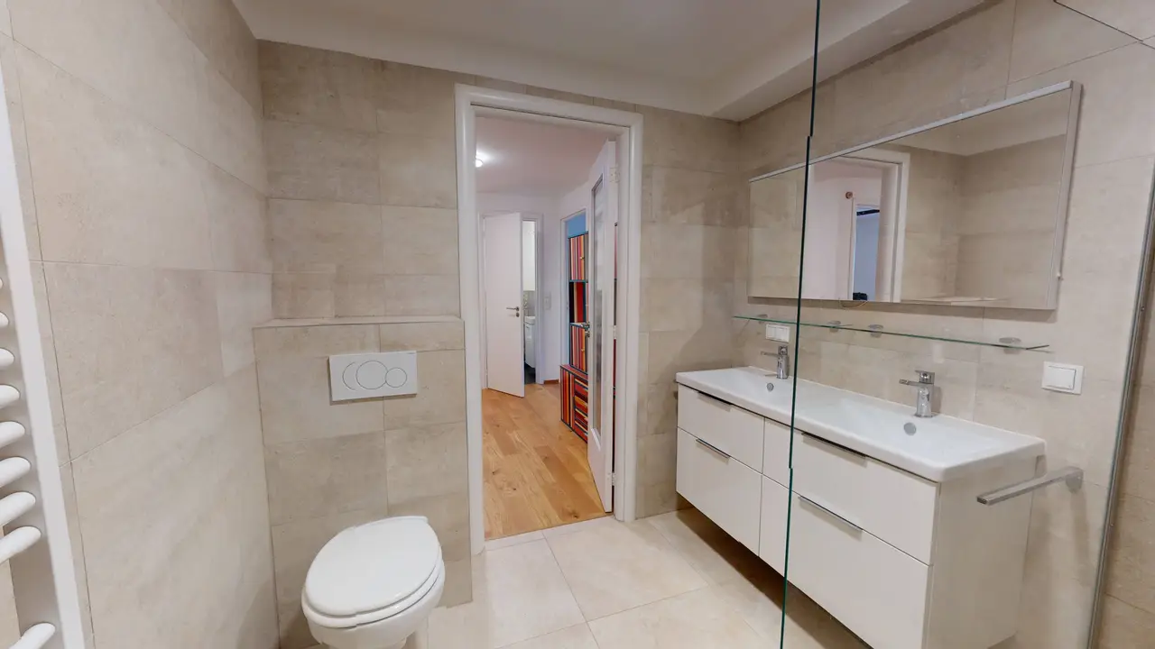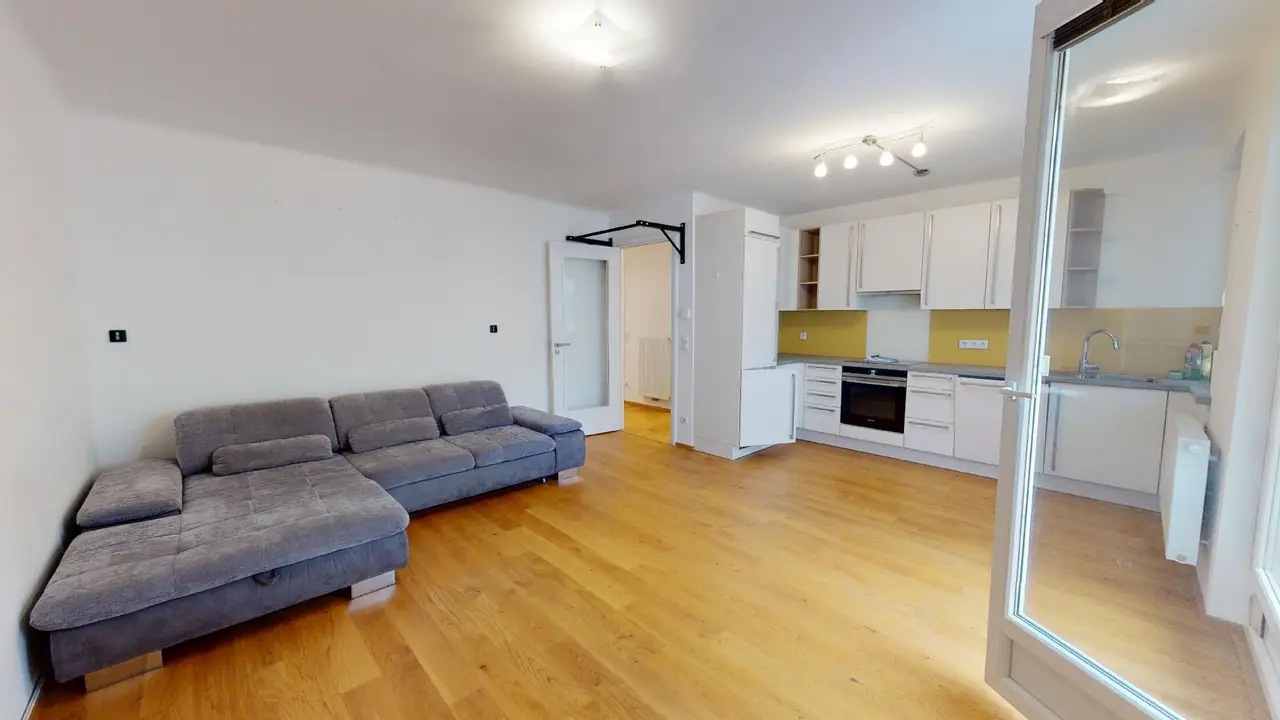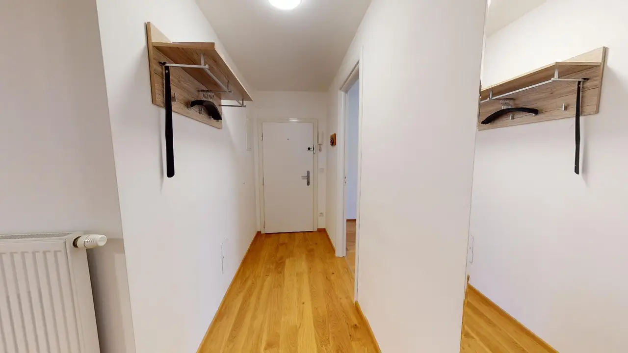 Über ein großes Vorzimmer gelangen Sie in die gemütliche Wohnung. Hier stehen Ihnen eine Wohnküche mit vorgelagerter Loggia, ein Schlafzimmer mit französischem Balkon und direktem Blick in den Park, ein weiteres Schlafzimmer, ein Badezimmer mit Dusche, Doppelwaschbecken und WC, eine separate Gäste-Toilette und ein Abstellraum zur Verfügung.