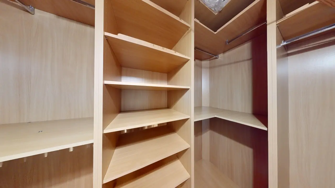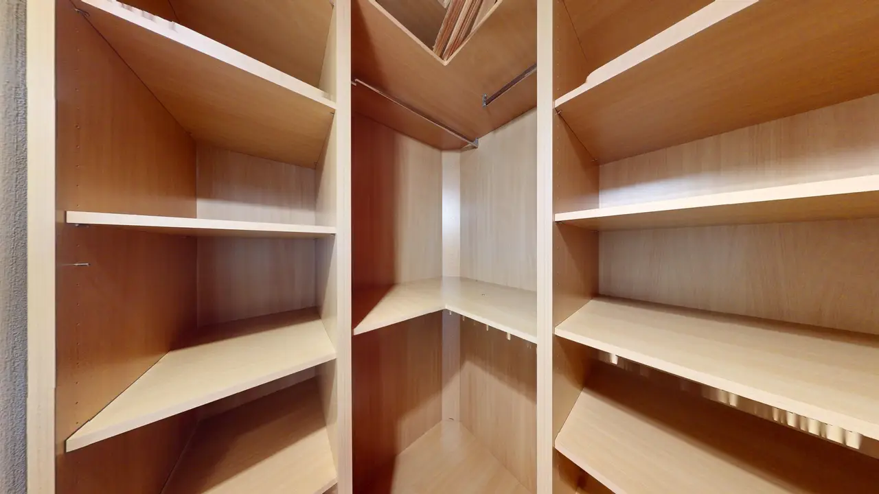 voll möblierter Schrankraum mit viel Stauraum dank beeindruckender Raumhöhe