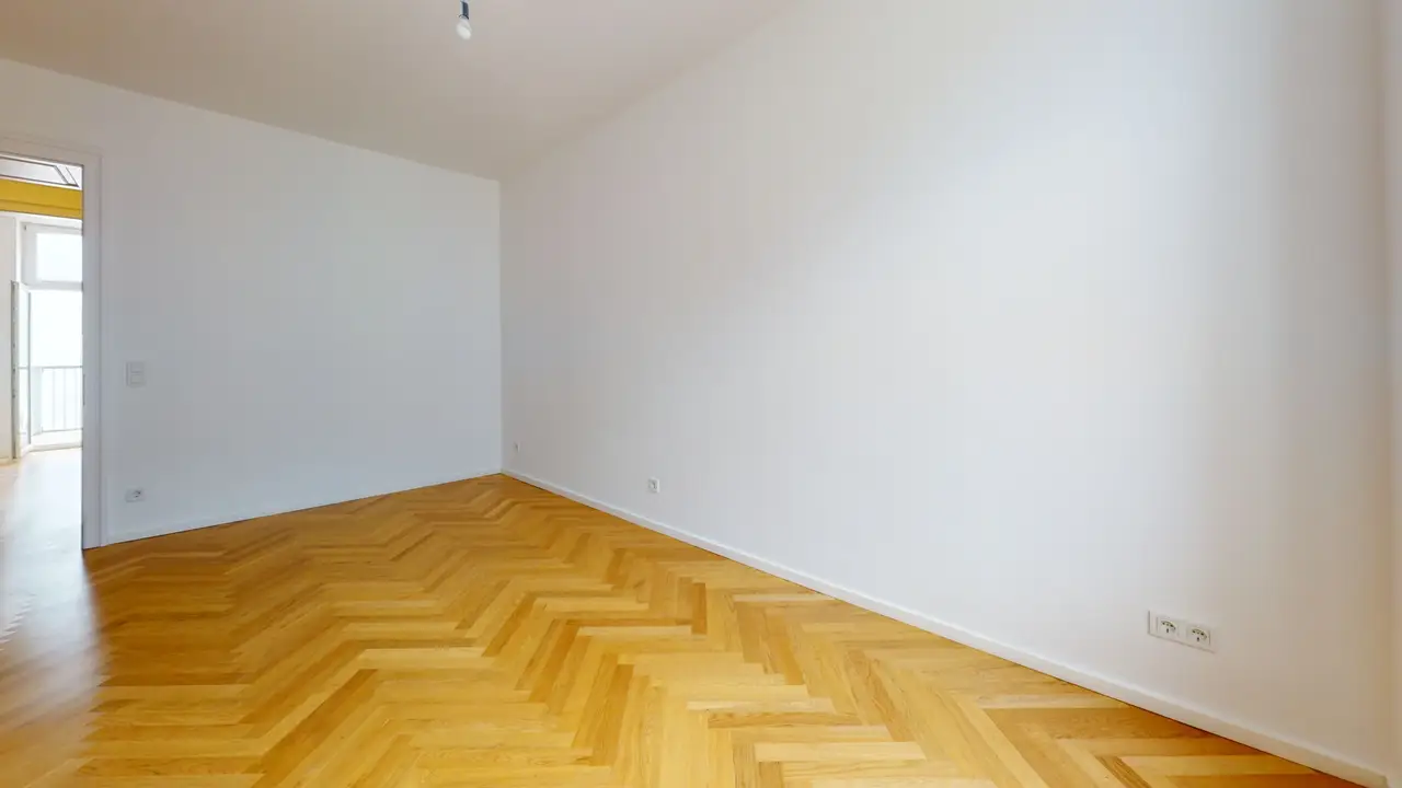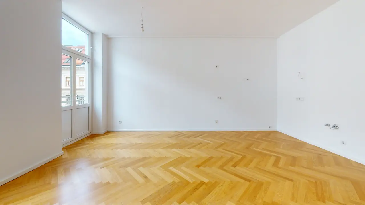 Die Wohnung befindet sich im neu erbauten 4. Stock und besticht mit 2 Balkonen und einer Wohnfläche von ca. 84 m². Die Wohnung verfügt über einen Vorraum mit Abstellraum, eine Wohnküche, ein separates WC und Badezimmer sowie zwei Schlafzimmer. Vom hofseitigen Schlafzimmer aus hat man Zugang zu einem Balkon, der sich vor allem im Sommer als optimaler Rückzugsort eignet. Von der Wohnküche aus hat man ebenso Zugang zu einem kleinen Balkon. Die Wohnung verfügt über eine Fußbodenheizung mit Einzelraumsteuerung sowie über eine Videogegensprechanlage, eine Sicherheitseingangstüre und Alt-Wien-Stil Innentüren. Im gesamten Wohnbereich ist hochwertiger Parkettboden im Fischgrät-Muster verlegt.
