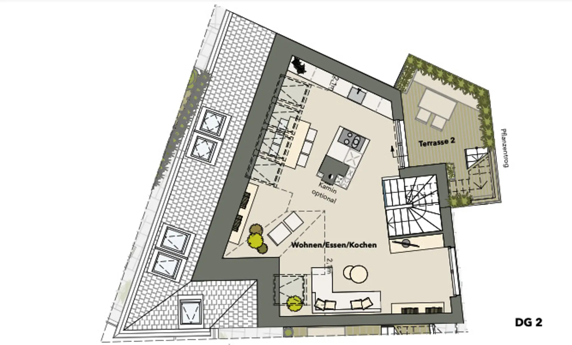 Der offen gestaltete Wohn-/Ess-/Kochbereich mit ca. 51,82 m² überzeugt durch seine Weitläufigkeit und sorgt durch großzügige Fensterflächen für eine helle und freundliche Wohnatmosphäre. Die Lage im Dachgeschoss verleiht dem Raum ein besonderes Wohngefühl und schafft gemeinsam mit den angrenzenden Freiflächen ein attraktives Zusammenspiel von Innen- und Außenraum.