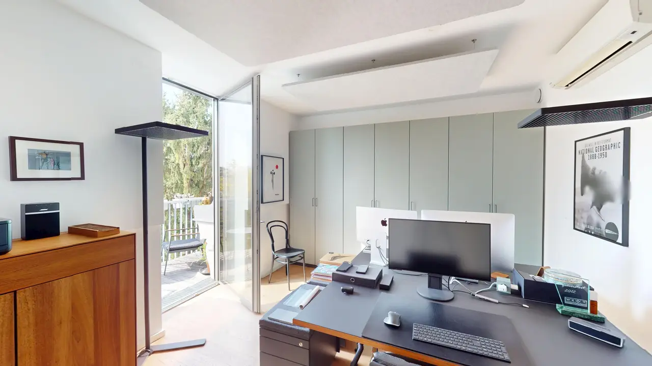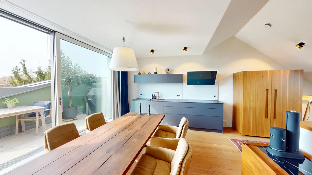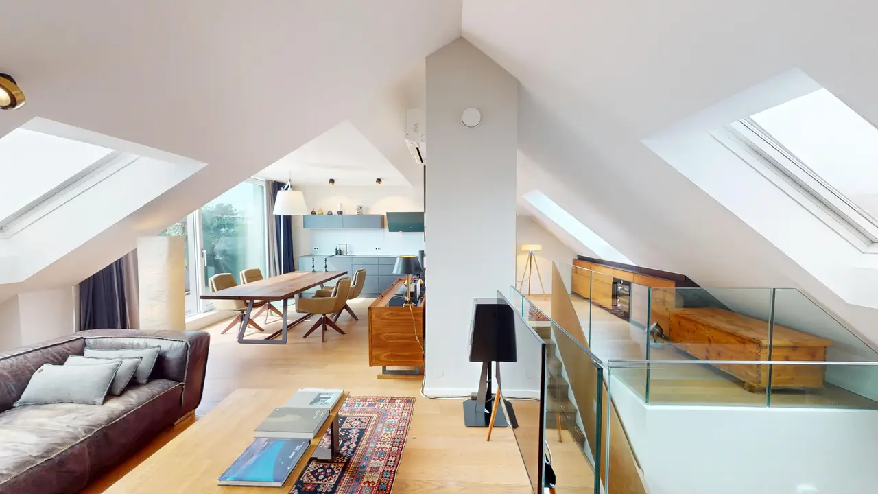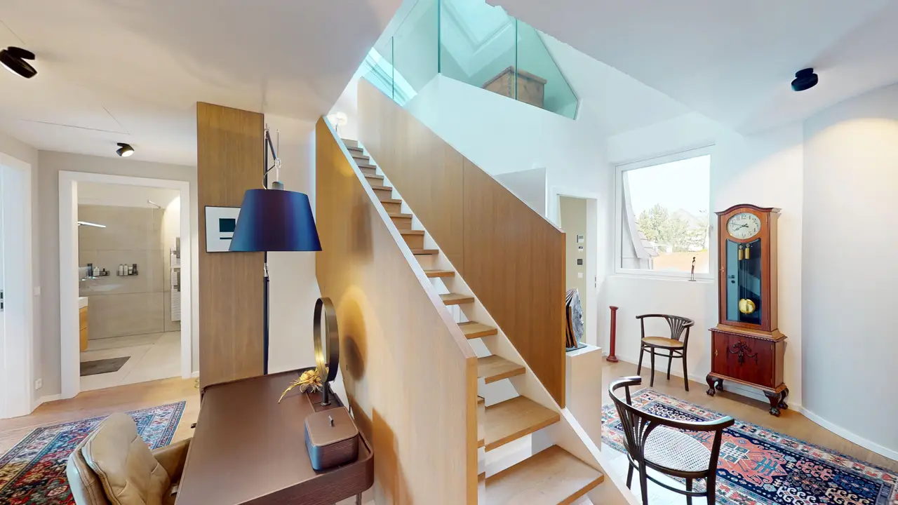 A través de una escalera, accede a la planta superior, que impresiona con un amplio salón y una cocina Bulthaup de alta calidad. En esta planta también se encuentra la terraza, que ofrece una hermosa vista al campo y a la ciudad.