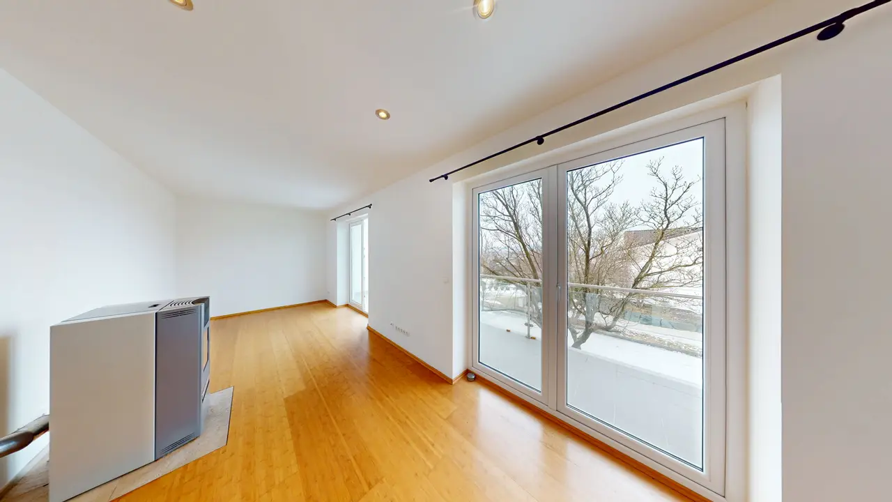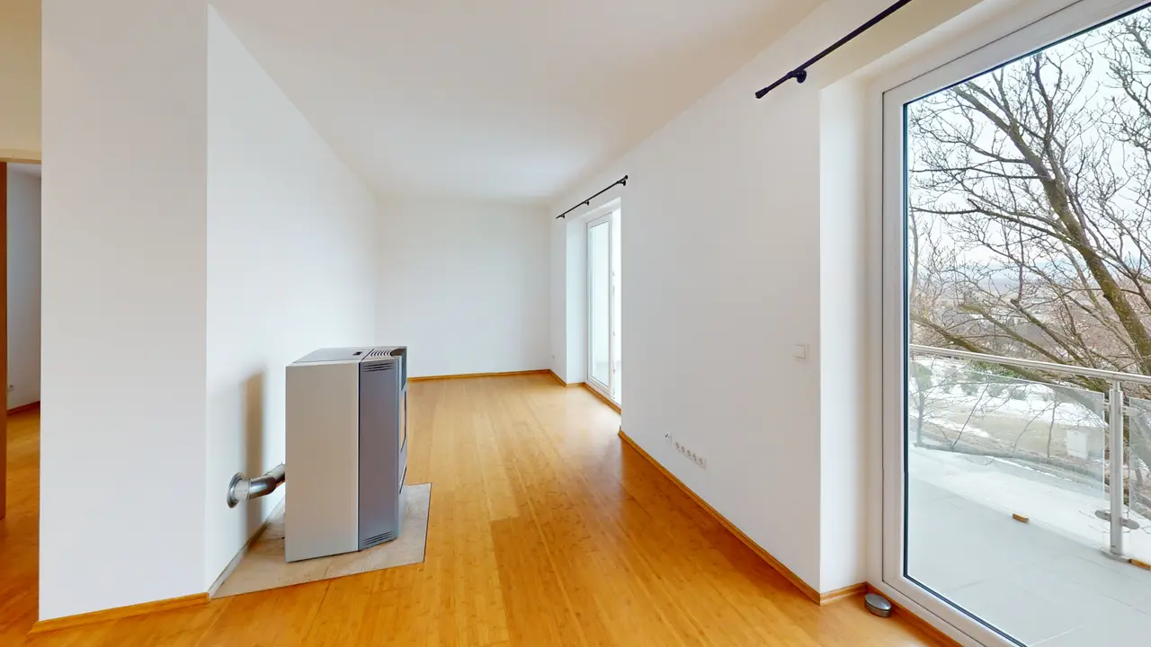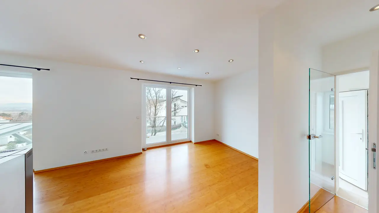 El piso en el primer piso forma la zona de estar central de esta casa unifamiliar y destaca por sus habitaciones luminosas y una agradable atmósfera de vivienda. Desde la sala de estar, el balcón y la terraza son accesibles directamente y ofrecen, debido a la ubicación elevada, una vista lejana del Schneeberg así como del paisaje circundante. La ubicación tranquila en Hornstein proporciona un entorno de vida relajado.