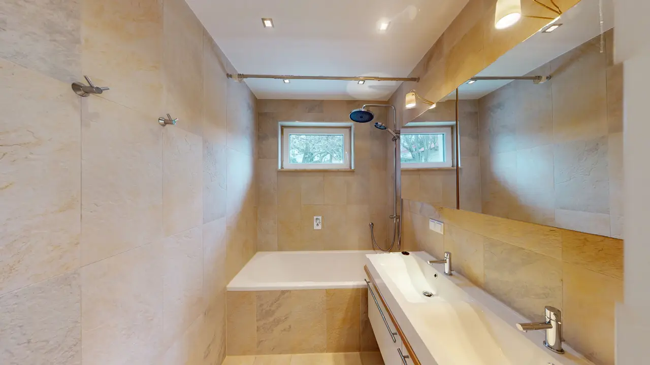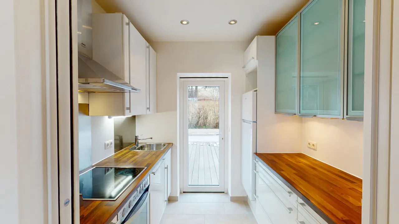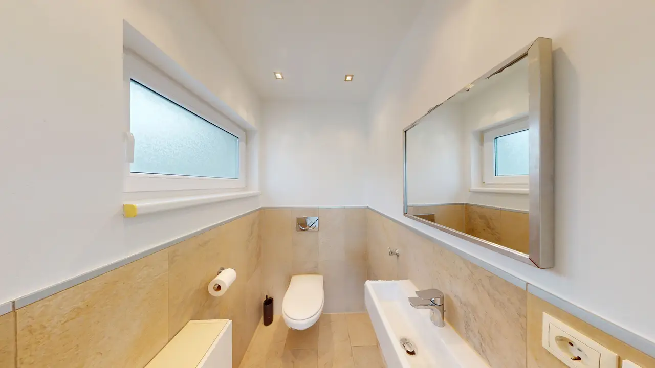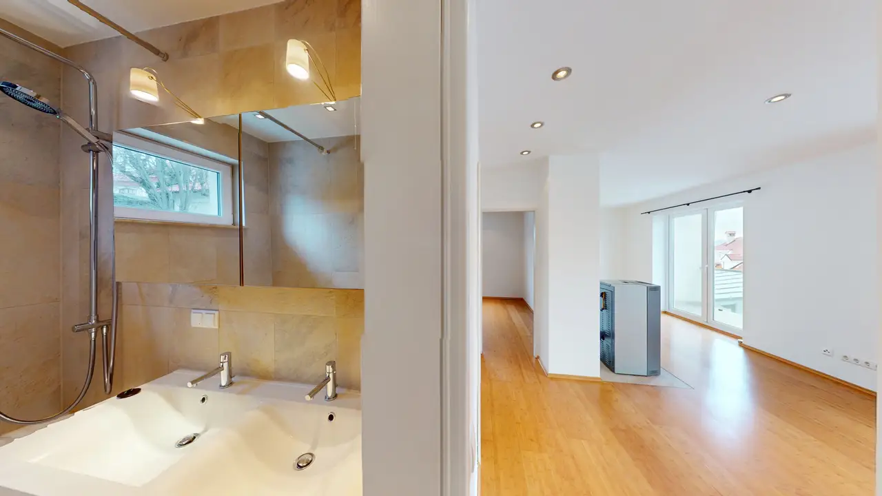 El piso en el primer piso forma la zona de estar central de esta casa unifamiliar y destaca por sus habitaciones luminosas y una agradable atmósfera de vivienda. Desde la sala de estar, el balcón y la terraza son accesibles directamente y ofrecen, debido a la ubicación elevada, una vista lejana del Schneeberg así como del paisaje circundante. La ubicación tranquila en Hornstein proporciona un entorno de vida relajado.