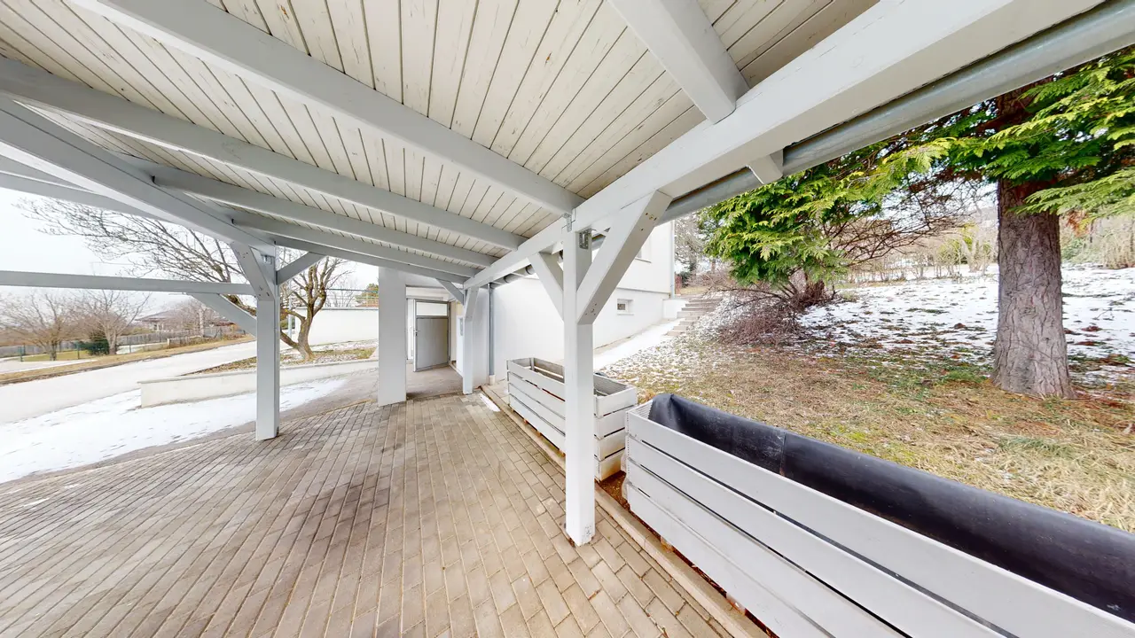 En la planta baja se encuentran un garaje, dos plazas de aparcamiento bajo el carport, un trastero y un cuarto de servicios. Un gran jardín complementa la oferta y ofrece espacio adicional en la naturaleza.