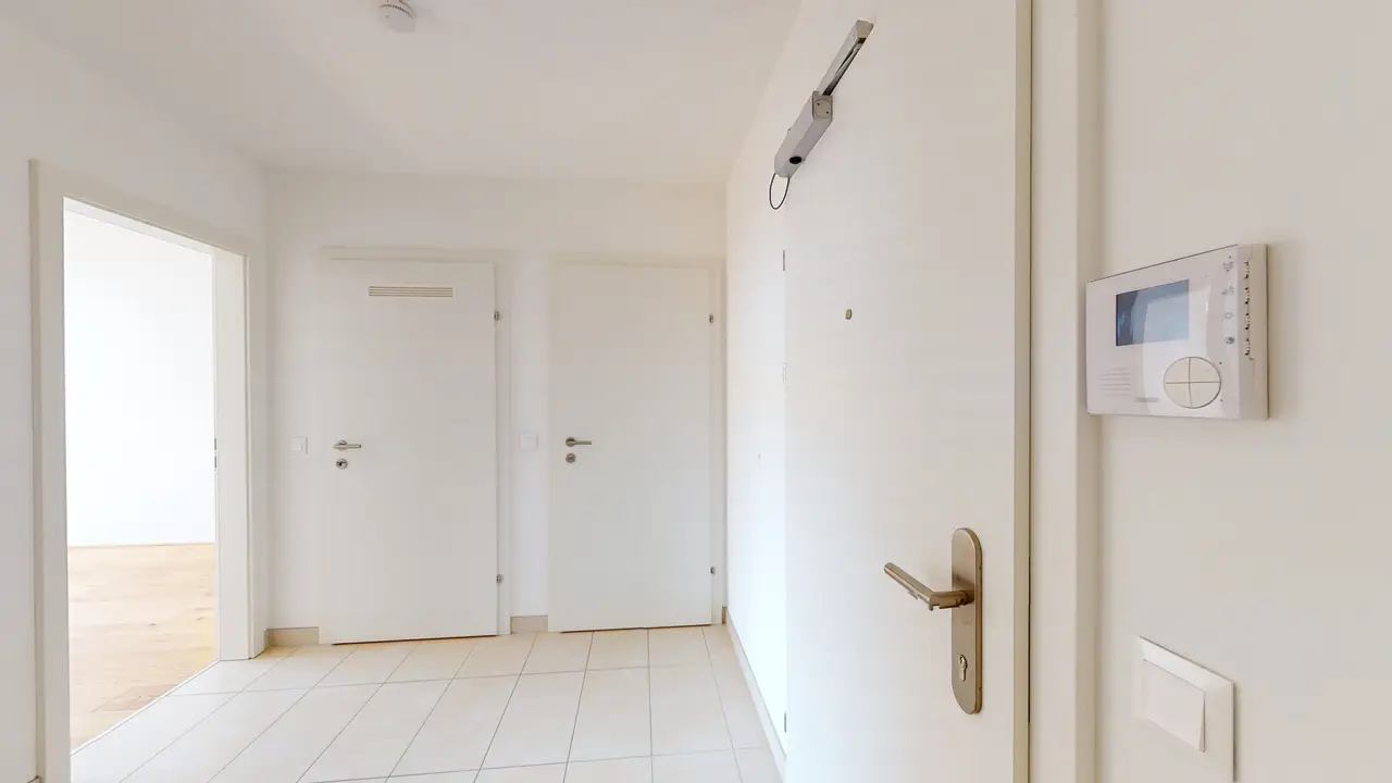 El brillante apartamento de 2 habitaciones (o 3 habitaciones) se encuentra en el 5º piso con ascensor (1º piso abuhardillado) de un edificio de apartamentos de nueva construcción y destaca por su buena distribución de espacios, así como por su estado de primera calidad. Dispone de una superficie habitable de 68 m² que se distribuye en vestíbulo, salón con cocina integrada, dormitorio, baño, despensa y un WC separado.