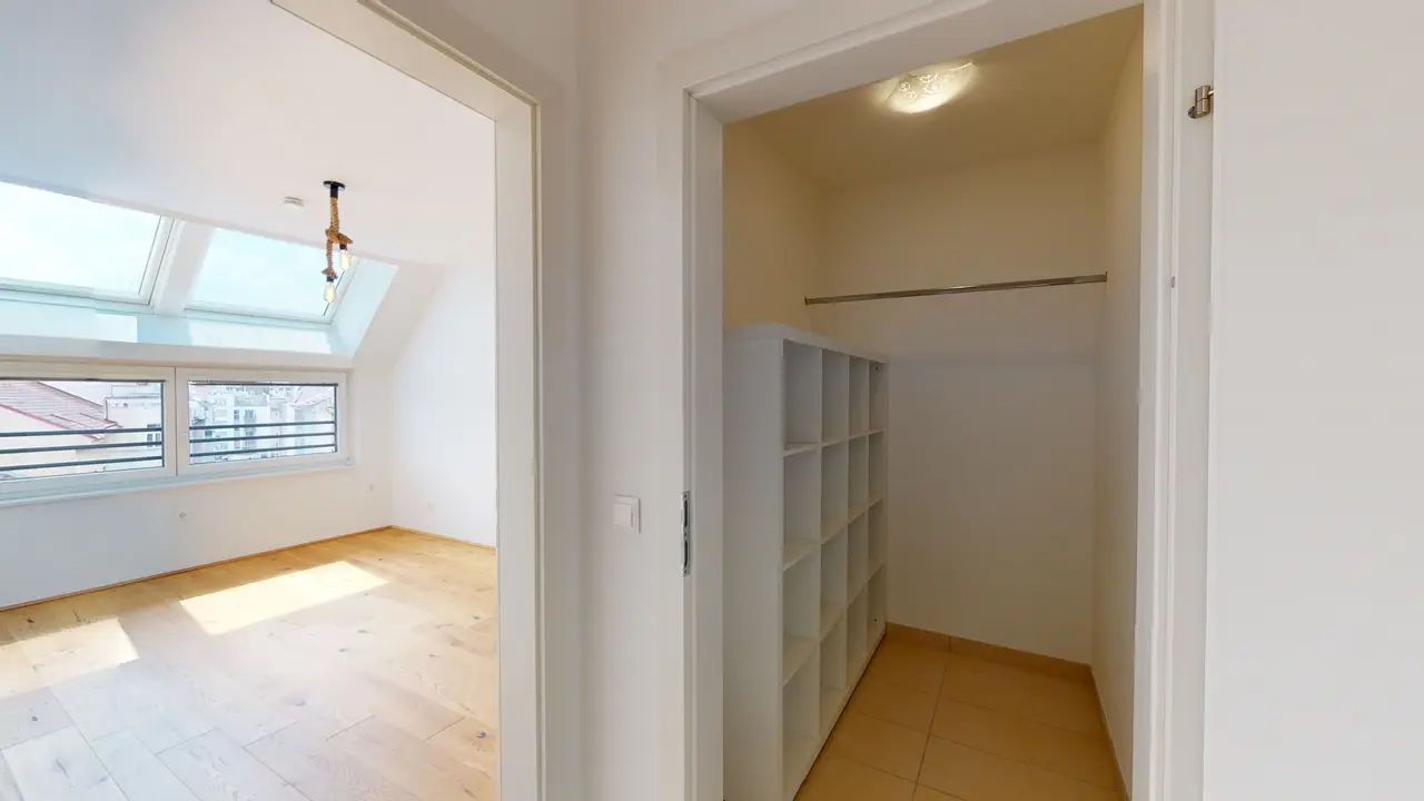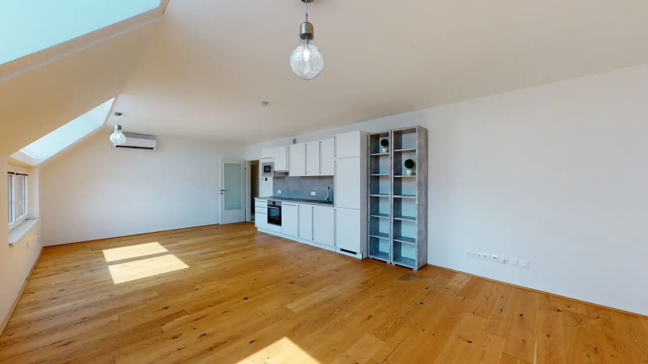 Al entrar en el apartamento, te encuentras en el vestíbulo, desde el cual tienes la posibilidad de acceder a todas las habitaciones de forma central. El apartamento tiene una muy buena iluminación y cuenta con un gran salón con cocina integrada. Si es necesario, la habitación se puede dividir de forma ideal, creando así otra habitación con poco esfuerzo. El salón y el dormitorio están caracterizados por grandes ventanas que ofrecen una hermosa vista sobre el 16º distrito. El ambiente abierto y luminoso completa el concepto armonioso y convierte el apartamento en un oasis de bienestar sobre los tejados de Viena.