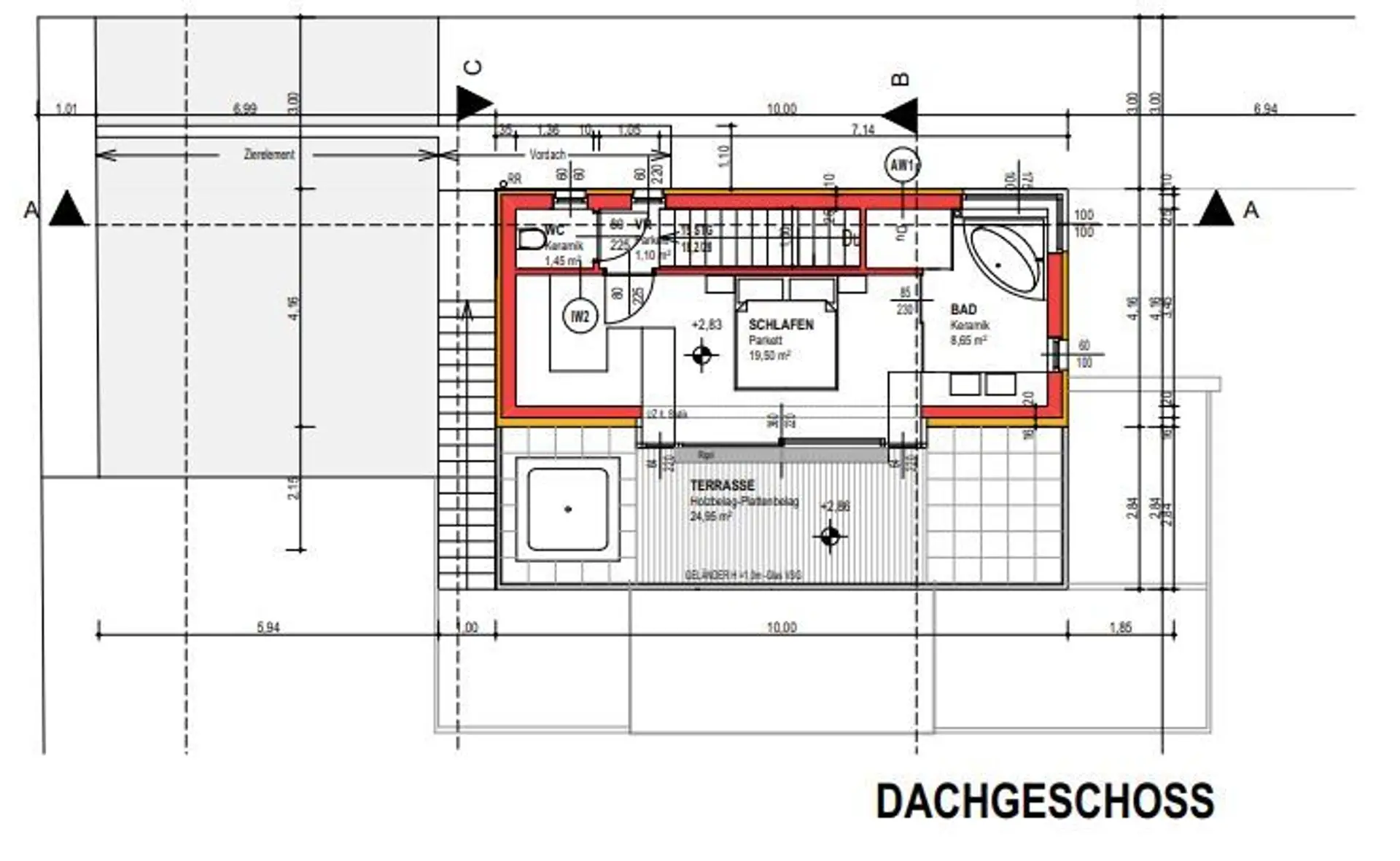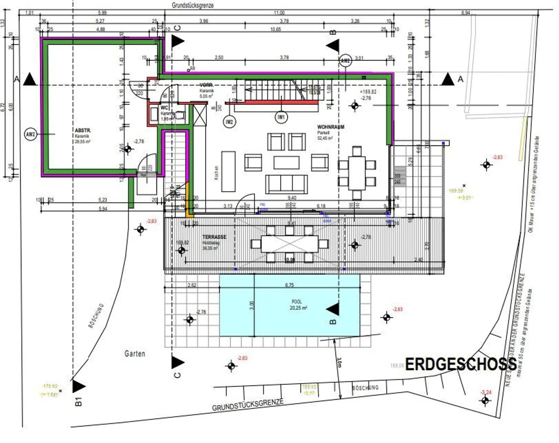 El estándar de construcción y equipamiento corresponde a una construcción masiva de alta calidad en hormigón armado y mampostería con aislamiento térmico eficiente, ventanas de madera-aluminio (valor U aproximadamente 1.1 W/m²K) y elegantes barandillas de vidrio. Se han comenzado las instalaciones eléctricas y de agua; la tecnología de la casa está preparada para calefacción por suelo radiante y bomba de calor. Se puede construir una piscina de hasta aproximadamente 20 m² de superficie de agua. El sótano ofrece condiciones ideales para una zona de fitness privada y una sauna.