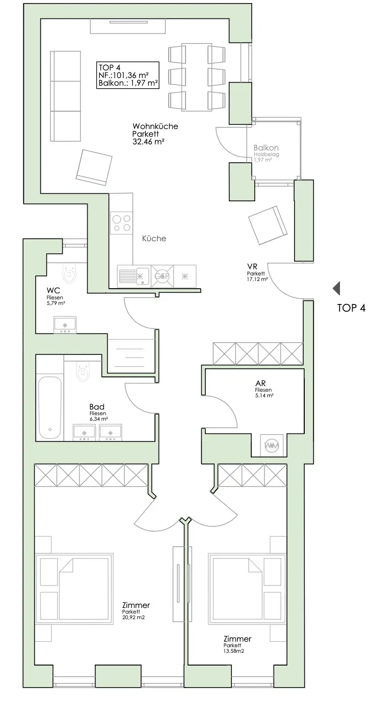 El apartamento se encuentra en el segundo piso y tiene una superficie de aproximadamente 101 m². Dispone de un vestíbulo con trastero, una cocina-salón, un baño y un WC separado, así como dos dormitorios. Desde la cocina-salón se tiene acceso a un balcón, que es un lugar de retiro óptimo especialmente en verano. El apartamento cuenta con calefacción por suelo radiante con control individual de las habitaciones, un video portero, una puerta de entrada de seguridad y puertas interiores de estilo antiguo vienés. En toda el área habitable hay un suelo de parquet de alta calidad con un patrón de espiga.
