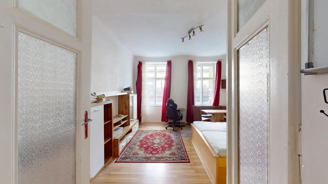 A lakás hasznos alapterülete körülbelül 42,50 m², és a ház magasföldszintjén található. Jelenleg a bérlemény tartalmaz egy tágas előszobát zuhanyzóval és beépített konyhával, egy nappalit, amely a Kolonitzplatzra néz, egy udvari hálószobát, valamint egy külön WC-t a folyosón. A lakáshoz pincehelyiség is tartozik.