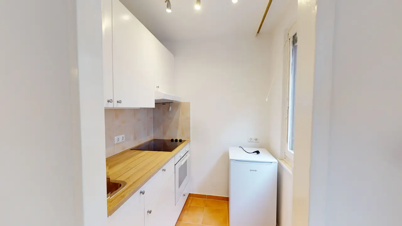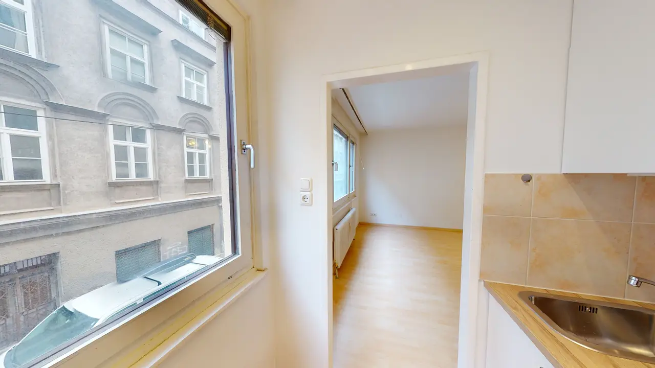A Wiedner Hauptstraße közelében található ez a garzonlakás egy 1971-es építésű, karbantartott lakóházban.