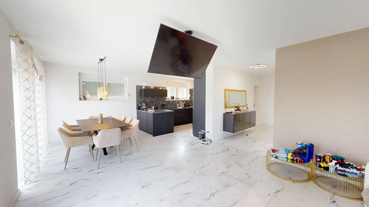 Опалення забезпечується енергоефективним повітряним тепловим насосом, який разом із підлоговим опаленням забезпечує рівномірний та комфортний розподіл тепла в усьому будинку. Сучасна кухня з високоякісною побутовою технікою функціонально спроектована та гармонійно вписується в житлову зону.
